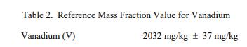 表 2 提供了釩 (V) 的參考質(zhì)量分?jǐn)?shù)值,以干質(zhì)量為基礎(chǔ)報告。NIST 參考值是一個未經(jīng)認(rèn)證的值,它是基于可用的真實值的最佳估計數(shù)據(jù);但是,這些值不符合 NIST 認(rèn)證標(biāo)準(zhǔn),并提供不確定性,所有已知或可疑的偏差來源尚未得到充分調(diào)查[1]。 V 的參考值基于使用標(biāo)準(zhǔn)添加方法校準(zhǔn)的單一 NIST 方法 (ICP-MS) 獲得的平均值。