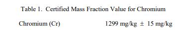 表 1 中提供了基于干質(zhì)量報告的鉻 (Cr) 認(rèn)證質(zhì)量分?jǐn)?shù)值。NIST 認(rèn)證值是 NIST 對其準(zhǔn)確性有最高置信度的值已知或可疑的偏倚來源已被調(diào)查或考慮 [1]。 Cr 的認(rèn)證值計算為方差加權(quán)平均值,基于使用 NIST [2] 標(biāo)準(zhǔn)添加方法校準(zhǔn)的電感耦合等離子體質(zhì)譜 (ICP-MS) 獲得的平均值,并提供單個結(jié)果的加權(quán)平均值由附錄 A 中列出的合作實驗室提供。
