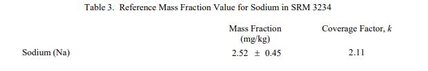 表 3 到表 6 提供了NIST SRM 3234豆粉(標(biāo)準(zhǔn)品) 中鈉、異黃酮、近似物、總膳食纖維、卡路里和氨基酸的參考質(zhì)量分?jǐn)?shù)值,以干質(zhì)量為基礎(chǔ)報(bào)告。NIST 參考值是未經(jīng)認(rèn)證的值,它是基于可用數(shù)據(jù)對(duì)真實(shí)值的最佳估計(jì);但是,該值不符合 NIST 認(rèn)證標(biāo)準(zhǔn) [1],并且提供的不確定度可能僅反映測(cè)量再現(xiàn)性,可能不包括所有不確定性來(lái)源,或者可能反映多種分析方法之間缺乏足夠的統(tǒng)計(jì)一致性。參考質(zhì)量分?jǐn)?shù)值來(lái)自 NIST 或合作實(shí)驗(yàn)室報(bào)告的結(jié)果。