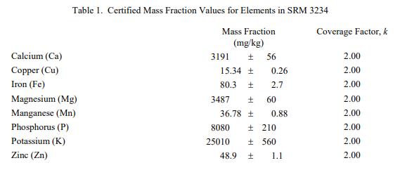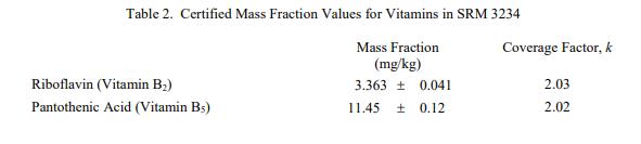 表 1 和表 2 提供了NIST SRM 3234豆粉(標(biāo)準(zhǔn)品) 中元素和維生素的認(rèn)證質(zhì)量分?jǐn)?shù)值,以干質(zhì)量為基礎(chǔ)報(bào)告。NIST 認(rèn)證值是 NIST 對(duì)其準(zhǔn)確性有最高置信度的值因?yàn)樗幸阎蚩梢傻钠妬?lái)源都已被調(diào)查或考慮 [1]。價(jià)值分配分析由 NIST 和合作實(shí)驗(yàn)室進(jìn)行。認(rèn)證值計(jì)算為 NIST 方法的平均值和合作實(shí)驗(yàn)室提供的平均結(jié)果的中位數(shù)(在適當(dāng)?shù)那闆r下)。所有值在沒有加權(quán)的情況下合并。相關(guān)的不確定性以大約 95% 的置信水平表示 [2-4]。