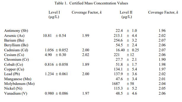 表 1 列出了 SRM 2668 人尿液中的有毒元素標(biāo)準(zhǔn)品 的 I 級(jí) 6 種元素和 II 級(jí) 14 種元素的認(rèn)證質(zhì)量濃度值。 NIST 認(rèn)證值是 NIST 對(duì)其準(zhǔn)確性有最高信心的值已知或可疑的偏見來源已被調(diào)查或考慮帳戶 [1]。數(shù)值來自 NIST 和合作實(shí)驗(yàn)室提供的結(jié)果的組合。